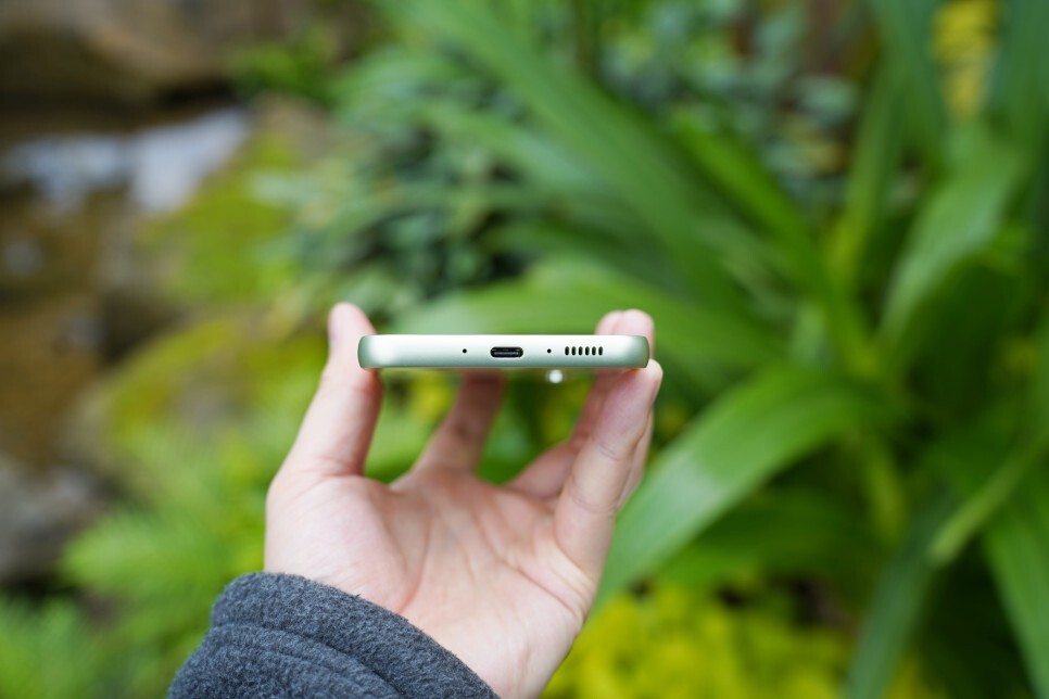 오른쪽 측면에 깨우기 및 볼륨 버튼과 상단에 유심 트레이, 아래쪽에는 USB C 타입 충전 포트가 위치해 있습니다.