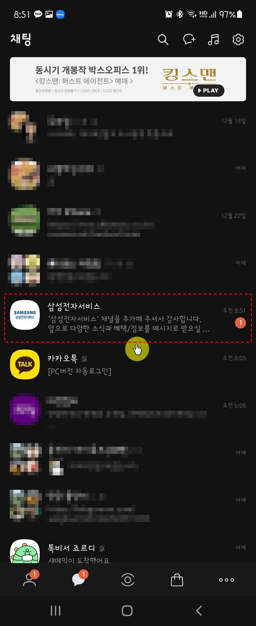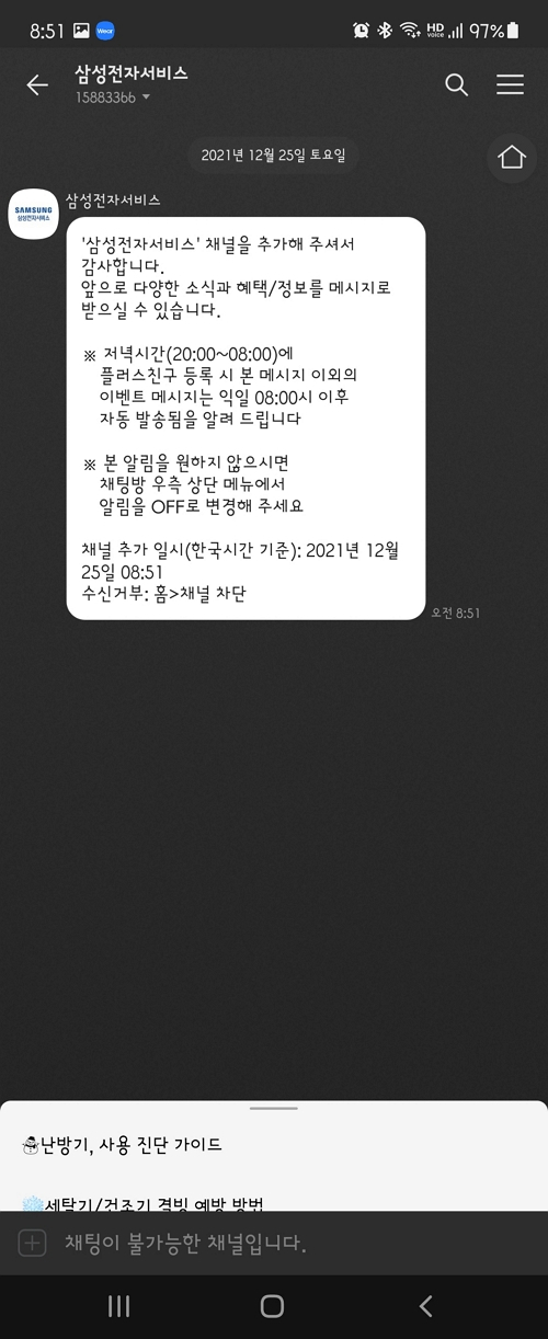 카카오톡 플러스친구인 삼성전자 서비스 채널이 추가되었다는 내용의 톡이 채팅방으로 발송된 것도 확인할 수 있습니다. 이제 새로운 소식이나 혜택/정보 등을 알림 메시지를 통해 받을 수 있습니다.