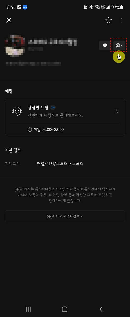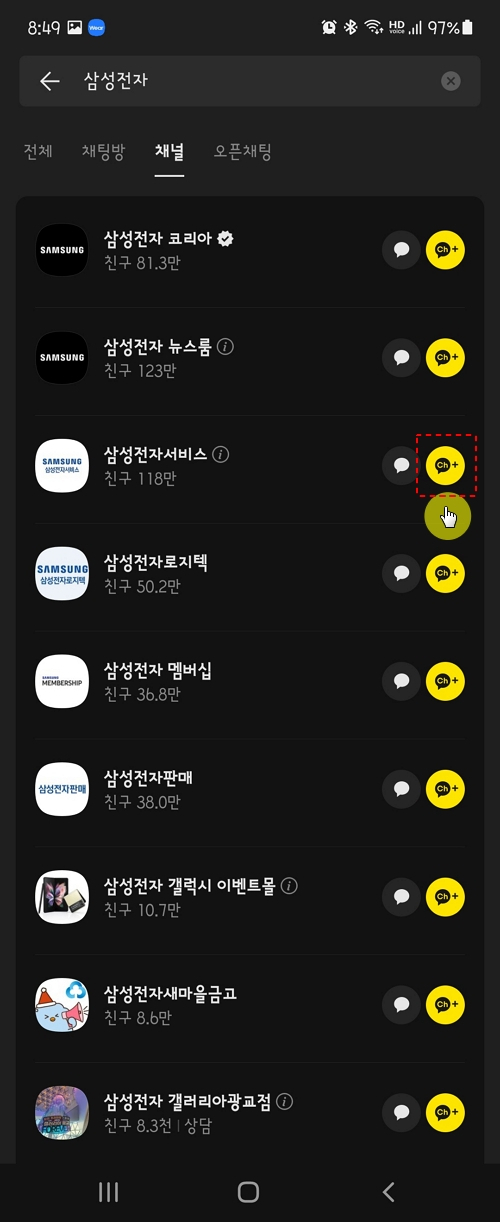큰 회사이니 만큼 채널도 굉장히 많네요. 저는 삼성전자 제품을 많이 사용하고 있으니 서비스와 관련된 내용의 소식을 받고 싶어 '삼성전자서비스'를 추가하기로 했습니다. 우측에 노란색 카톡 아이콘을 터치하고 "채널추가" 버튼을 탭 합니다.