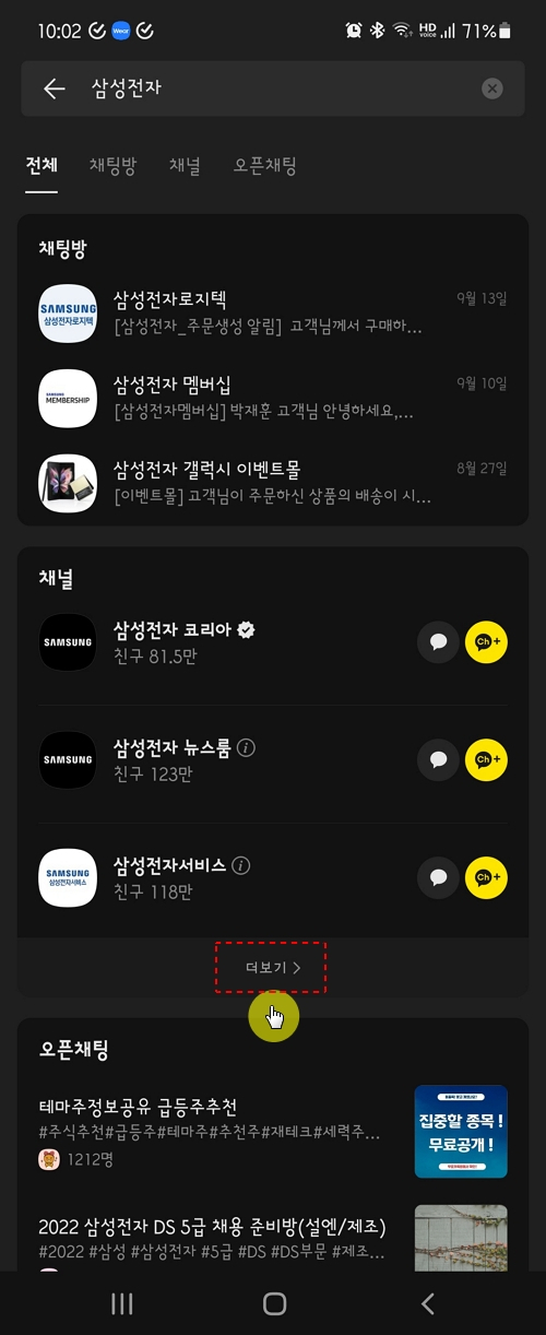 그리고, 상단에 돋보기 모양 아이콘을 눌러 추가할 채널 이름을 입력하고 검색합니다. 예를 들어, 삼성전자에서 판매하는 제품이나 관련된 서비스 정보에 대해서 소식을 받아보고 싶어 추가하는 경우에 관련 키워드를 입력하여 색인 합니다.