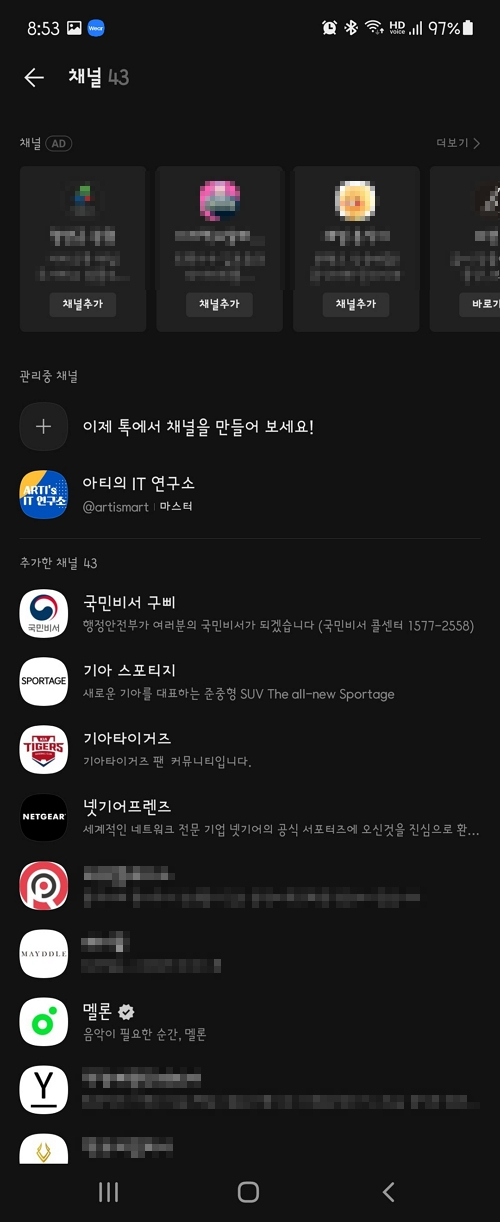 저는 현재 43개의 채널이 추가된 상태이며 이중에는 잘 찾지 않거나 소식에 대해 궁금하지 않는 곳이 몇 군데 보입니다. 카카오톡 플러스친구를 삭제한 항목을 선택한 후 우측 상단에 Ch라고 되어 있는 조그만 아이콘을 탭 합니다.