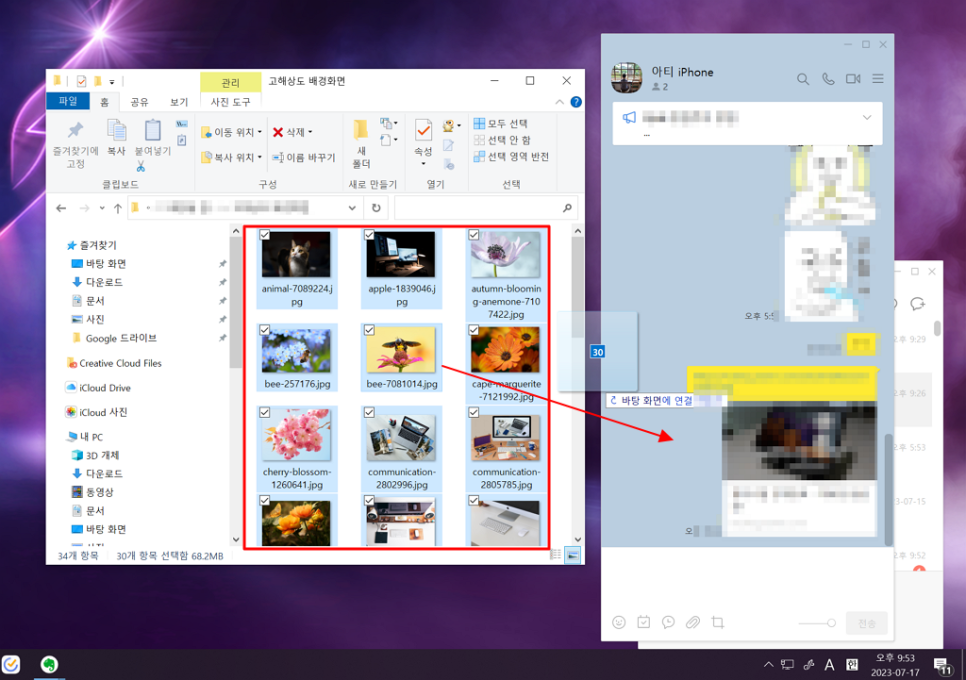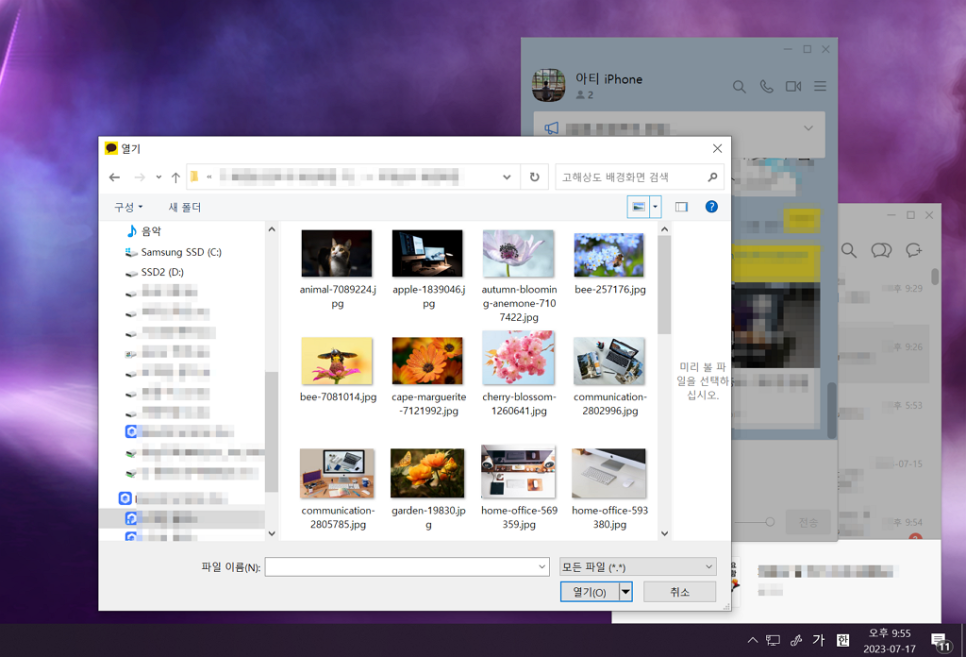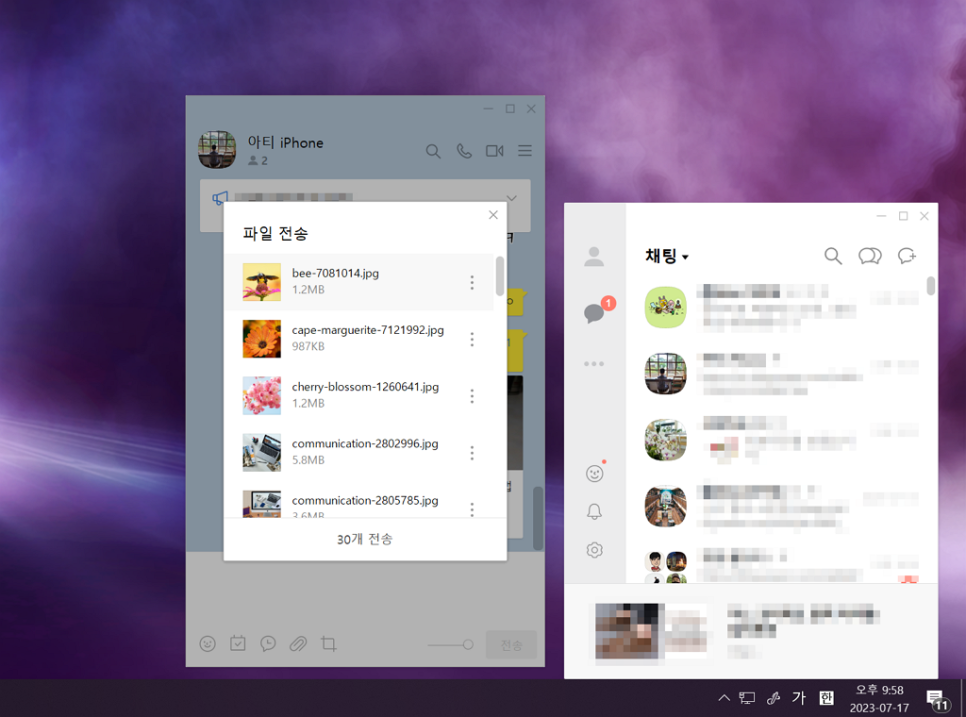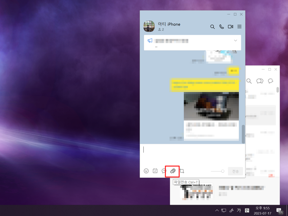 전송 방법은 간단하게는 드래그 앤 드롭으로 파일 탐색기에서 대화방 화면에 올려놓으면 편리하게 전송할 수 있습니다.