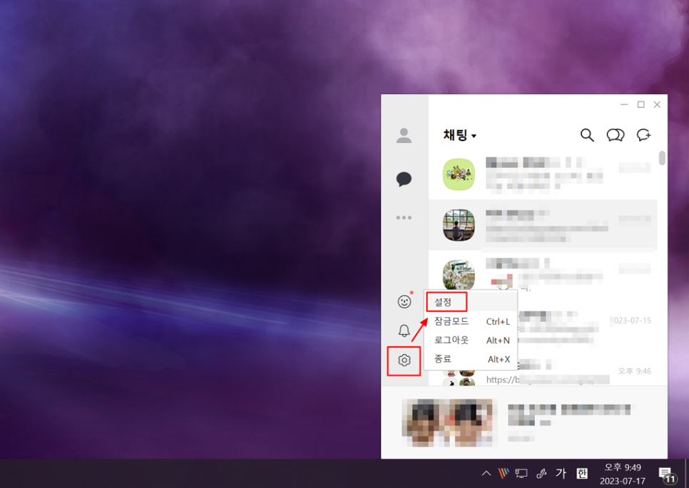 PC 버전에서도 모바일과 마찬가지로 묶어서 보낼 수 있습니다. 좌측 하단에 톱니바퀴 모양 아이콘을 클릭하고 [설정] 버튼을 선택합니다.