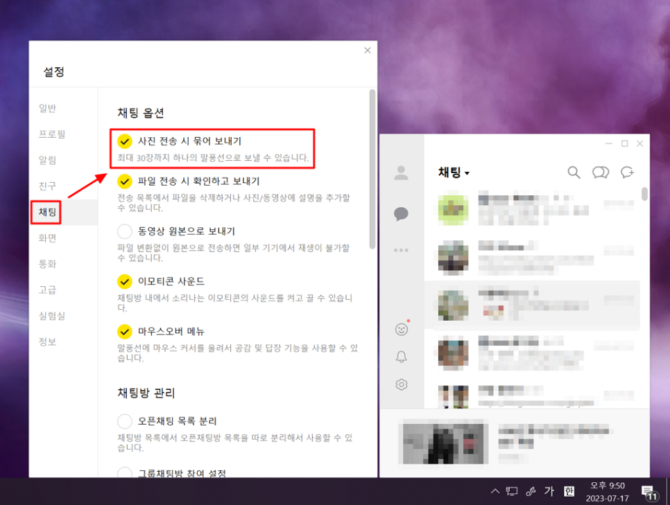 설정 화면 좌측에 [채팅] 탭을 클릭하면 옵션에 [사진 전송 시 묶어 보내기]를 활성화 해주면 됩니다. 최대 30장까지 전송하는 것은 모바일과 동일하며 말풍선 하나로 보낼 수 있어 받는 사람이 카톡 폭탄을 맞지 않아 서로에게 유익합니다.