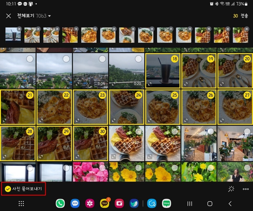 이제 넓은 화면에서 전송할 이미지를 최대 30장까지 선택해줍니다. 하나의 톡으로 한번에 최대로 보낼 수 있는 개수가 30개입니다. 그리고 왼쪽 하단에 [사진 묶어보내기] 체크 박스를 터치하여 노란색 V표로 활성화 되도록 하면 됩니다.