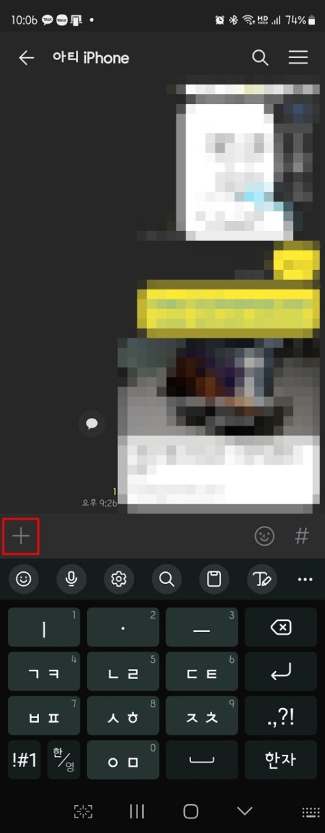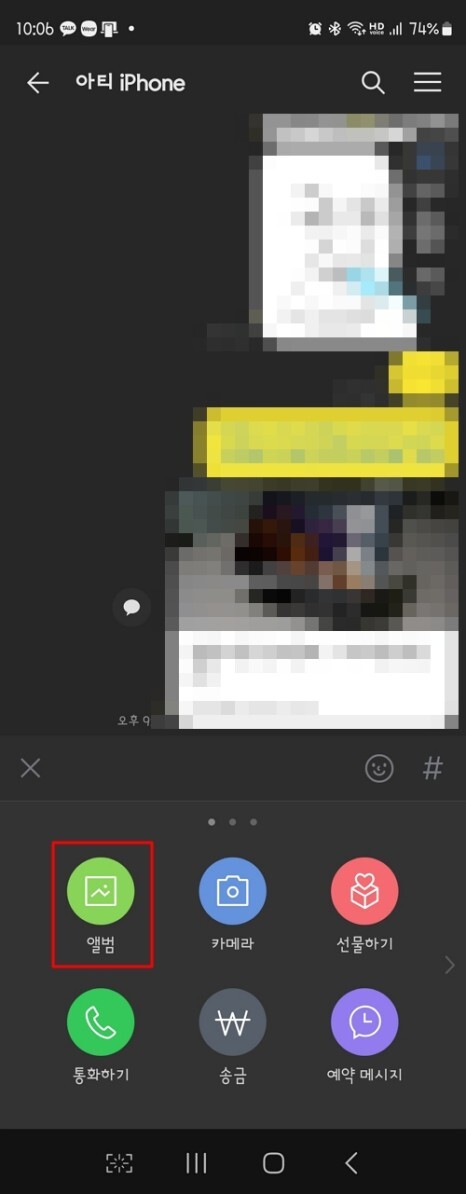 우선 모바일에서 어떻게 하는지 알아보겠습니다. 전송하려고 하는 톡방에 들어간 후 채팅 장에서 + 버튼을 누르고, [앨범] 항목을 선택해 주세요.