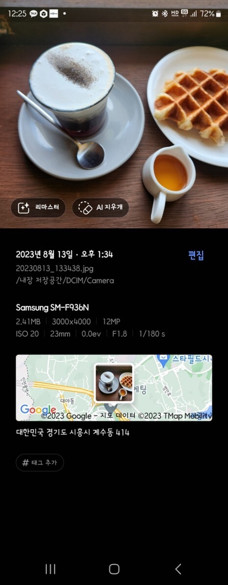 사진을 선택하여 보다가 위로 화면을 스와이프 하면 상세정보 화면이 바로 나타나고, 여기서 리마스터나 AI 지우개 기능을 이용 이미지를 빠르게 편집할 수 있게 되었습니다.
