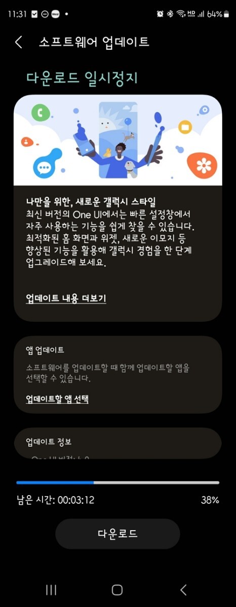 이렇게 앞에 숫자가 바뀌는 대규모 업데이트의 경우에는 파일 용량도 크기 때문에 다운로드 및 진행 과정에서 시간도 다소 걸립니다. 중요한 전화나 메시지를 기다린다면 그 시간은 피하시고 가급적 새벽시간이나 여유 있을 때 하는 것이 좋습니다.