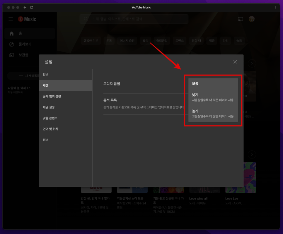 설정 화면이 나타나면 좌측에 [재생] 탭을 클릭한 후 오디오 품질에서 "보통 / 낮게 / 높게" 중에서 품질을 변경하여 사용할 수 있습니다.