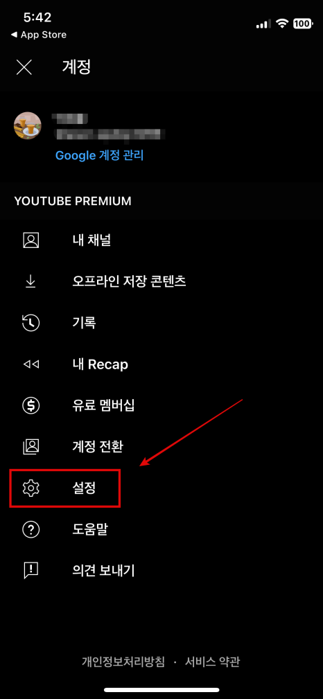 모바일에서는 조금 방법이 다른데요, 앱 우측 상단에 프로필 아이콘을 선택한 후 계정 화면에서 [설정] - [재생 및 제한 사항]을 차례로 선택해 줍니다.