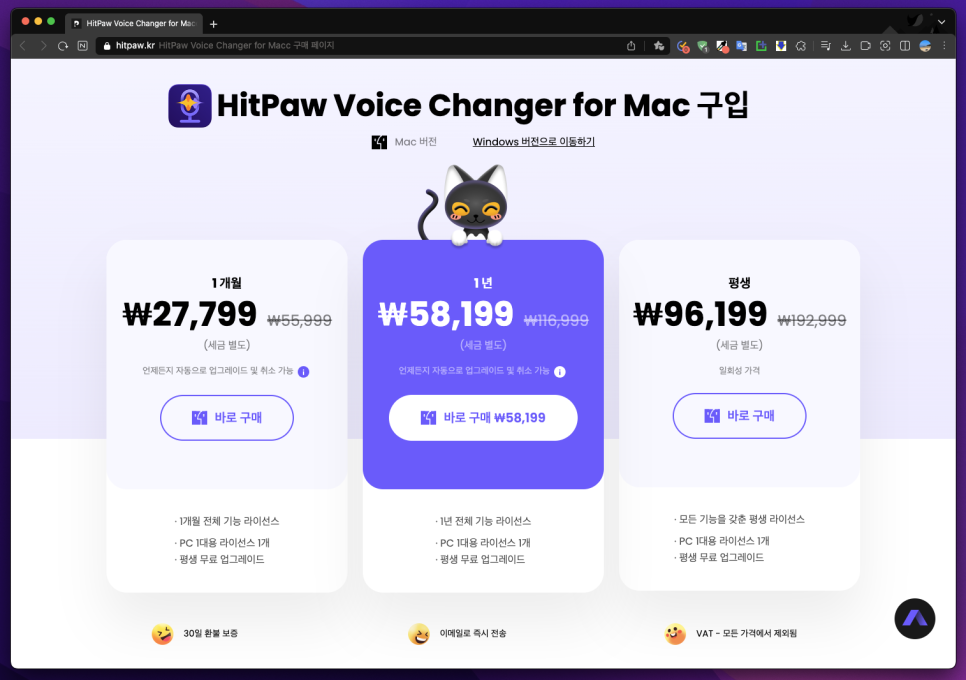 무료 다운로드로 사용하는 것도 가능하지만 제공되는 목소리가 한정적이라 모든 기능을 활용하고 싶다면, 라이선스를 구매하는 것이 좋습니다. 가격 정책은 1개월, 1년, 평생 옵션이 있으며, 30일 환불 보장 및 24시간 사후 서비스까지 받을 수 있으니 설치하시고 이용해 보세요.