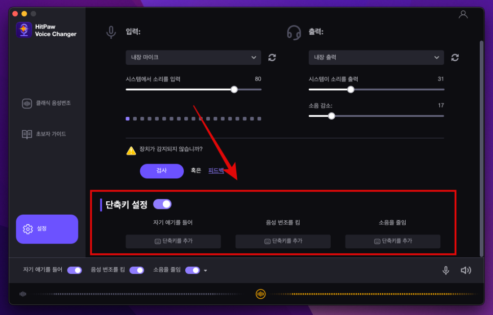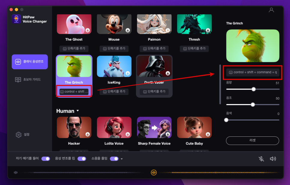 또, 단축키 설정을 통해 콘텐츠 제작 및 게임 플레이 중 일때 매번 HitPaw Voice Changer 음성 변조 프로그램을 실행할 필요 없이, Mac 단축키 조합을 이용해 간편하게 옵션을 변경할 수 있습니다.
