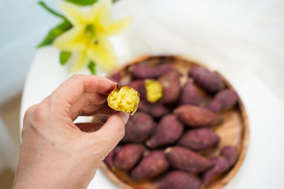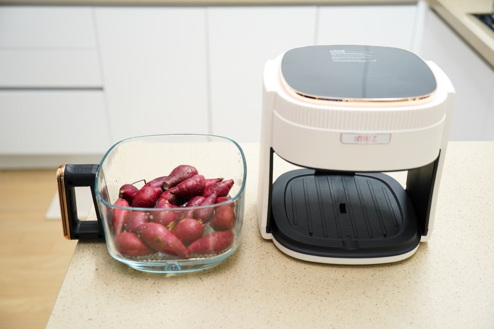 이번에는 한입 고구마도 구워봤어요. 예전에는 물에 삶거나 무수분 조리법을 이용하기도 했지만, 이렇게 뮤잉 글라스 에어프라이기 이용해서 조리하면 시간도 오래 걸리지 않고 군고구마처럼 구워져서 훨씬 맛있더라고요.
