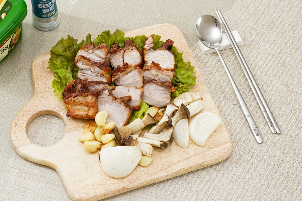 육류를 좋아하는 사춘기 아들의 성장을 위해 통 삼겹살 구이도 자주 하는 편인데요, 고기에 밑간과 칼집을 낸 후 약 200도에서 25~30분 정도 조리해 주면 겉은 바삭하고 속은 촉촉한 통 삼겹살이 완성됩니다. 요리 중간에 고기를 한 번 뒤집어주면 더욱 고르게 익습니다.