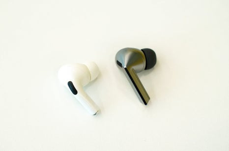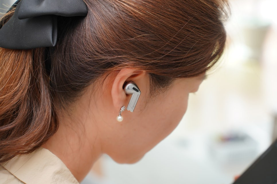 기존 무선 이어버드의 디자인에서 벗어나, 날카로운 모서리가 특징인 줄기형 디자인이 애플 에어팟과 비슷한 형태를 가졌지만 실물의 느낌은 전혀 다르게 느껴집니다.