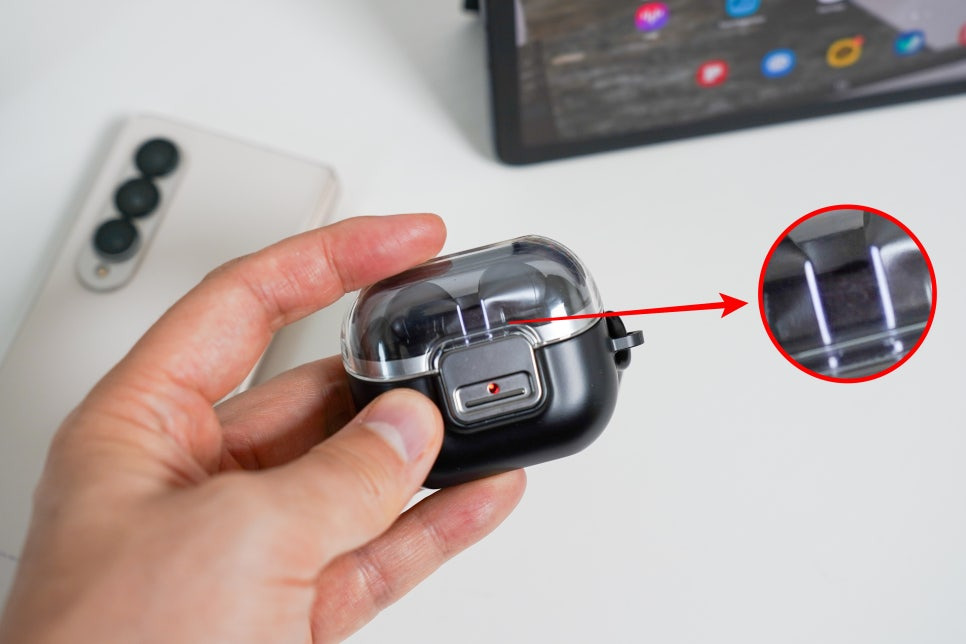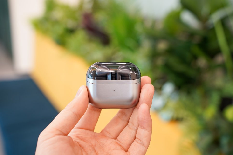 충전 케이스 또한 주목할 만한 디자인 요소입니다. 이번에 새롭게 재설계된 케이스는 투명한 뚜껑을 통해 내부의 이어버드를 확인할 수 있으며, 둥근 모서리로 손에 쥐었을 때 그립감도 매우 좋고 부드럽게 마감되어 주머니에 간편하게 넣고 다닐 수 있는 점도 만족스럽습니다.